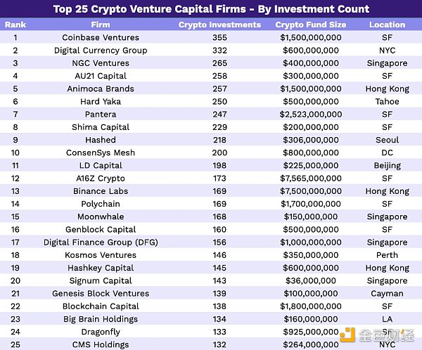 按最近 12 个月投资数量排名的顶级加密货币风险投资公司。