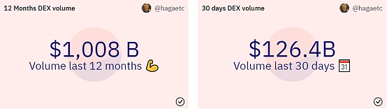 DEX近1年的交易量达到万亿美元级别,近30日交易量为1264亿美元。