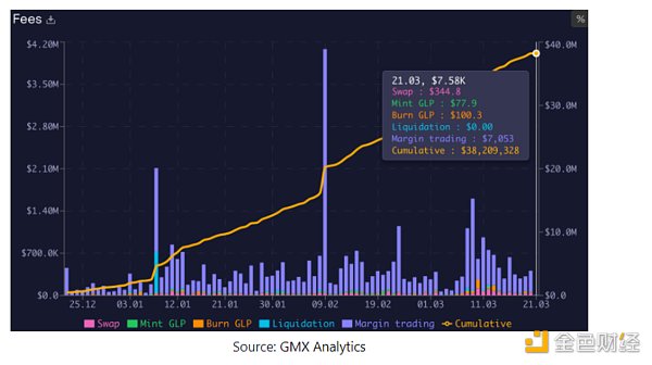 由于Optimism链的生态基金的分配,Optimism项目长期以来一直为用户提供OP代币奖励。Arbitrum终于释放了为其协议提供类似激励的能力。虽然Arbitrum GMX的主导地位已经下降到Arbitrum TVL的25%,但这一受degen青睐的平台继续赚取大量收益,在过去三个月里收取的费用将近4000万美元。