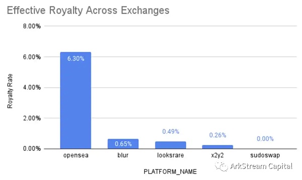 根据 Proof 研究总监 NFTstatistics.eth 数据, Blur 整体平均版税率仅为 0.65%,并带动了整体 NFT 市场版税的下降。