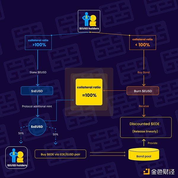 当价格下跌抵押率低于 100% 时,Bond 机制启动,用户将 EUSD 出售给协议获得相当于打折的 EDE 代币。协议销毁用户出售的 EUSD,并将抵押率逐渐拉回100%。