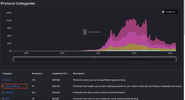根据defillama 数据,截至今日,存入流动性质押协议(Liquid Staking)的加密资产总价值为 141 亿美元,已成为第二大加密市场领域。DeFi 借贷协议锁定的总价值为 137 亿美元,位居第三,而DEX以 194 亿美元的存款位居榜首。