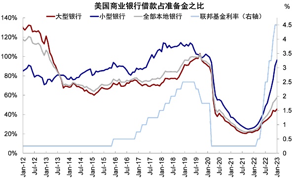 杠杆方面,金融危机后,美国金融部门在强监管下整体杠杆处于较低水平,且资本充足率也相对健康,因此发生大面积的债务危机的可能性似乎并不高,上述事件可能无法代表整个美国银行体系。2008年金融危机后,美国金融部门实现了较好的去杠杆。截至3Q22,金融部门杠杆水平从2008年金融危机期间的123%回落至3Q22的75%,资产负债表质量相对健康(《从杠杆角度看紧缩成本和衰退压力》)。进一步从不同规模银行的资产负债表来看,小型商业银行的流动性充裕度收紧更为明显,但美国大型银行及本地商业银行整体仍相对健康。在美联储持续加息缩表的背景下,银行准备金回落明显,迫使银行借款需求增加。小型银行准备金占总资产比例已回落至6%(基本为疫情前水平);借款占准备金比例自去年3月以来持续抬升,截至1月已基本接近疫情前水平(96%)。相比而言,大型银行相对更为健康。