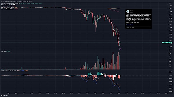 SVB倒闭的黑天鹅引发了一系列连锁危机,并蔓延至了加密市场。3月11日,稳定币USDC发行商 Circle 发推表示,在其共计约 400 亿美元的资金储备中,有大约 33 亿的现金储备存放在 SVB。Circle发布声明后,其对SVB的风险敞口同样引发市场的恐慌。为了减少损失,投资者开始抛售他们的 USDC 以换取如 Tether (USDT)的其他稳定币,USDC面临严重挤兑,其价格出现持续性脱锚,最低降至0.88 美元。同时,Binance、Coinbase 等中心化交易平台均宣布关闭 USDC 的部分兑换服务。