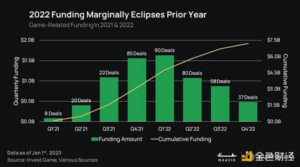 炒作、FOMO 和投机导致人才、机构和散户投资纷纷涌入。2022 年第一季度,投资达到顶峰,金额超过 37 亿美元,50% 的加密货币投资都与游戏有关。