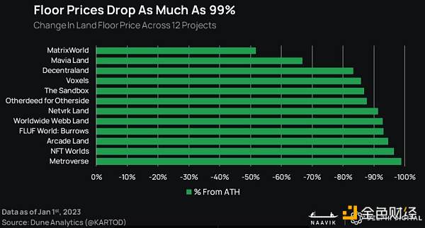 元宇宙大热催生地产泡沫。与 Web2 相比,Web3 世界中地产的市场估值和活跃用户之间仍然明显差距。尽管顶级 Web3 项目的市场估值下降 71%,但其人均估值(以每位用户算)仍是游戏 Roblox 的 200 倍。