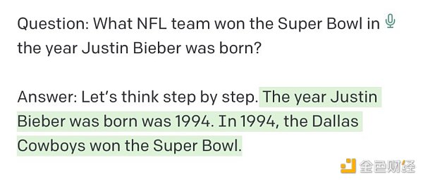 比如,有些提示工程师会引导 AI「一步步思考」,这种技巧被称为思维链。 去年 10 月,提示工程师 Riley Goodside,先是询问了 GPT-3「哪支球队在贾斯汀·比伯出生的那年赢得了超级碗?」 GPT-3 给出了错误的答案「绿湾包装工队」,正确答案是达拉斯牛仔队。
