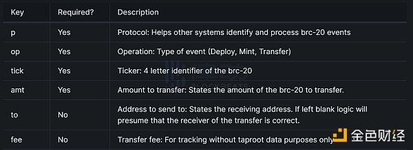 「fee」:转账费用。非必须包含的关键词,该关键词定义转账费用数额。目前,该关键词只是为了用于 Dune 看板的数据跟踪测试(在没有 Taproot 数据的情况下)。