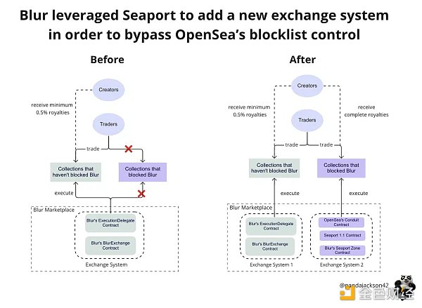 2 月 1日,Blur 通过利用 OpenSea 的 Seaport 创建了一个新的 NFT 交易系统,绕过 OpenSea 的黑名单控制。由于 Seaport 不在 OpenSea 的黑名单中,导致拉黑 Blur 的 NFT 项目现在可以通过新系统进行交易,并强制执行版税。