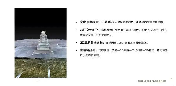 首先物品,比如建立文物信息档案,通过3D扫描全面展现文物细节,紧邻更精确的文物信息档案;热门文物IP开发,依托文物自身的文化价值和IP属性,开发“云观赏”平台,扩大受众的社会影响力;3D复原受损文物,人们可以穿越历史,窥见文物历史原貌;价值链延伸,可实现“文物-3D扫描-二次创作-3D打印”的闭环流程,延伸价值链。