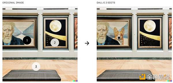 除了图像生成质量高,DALL·E 2 最引以为傲的是 inpainting 功能:基于文本引导进行图像编辑,在考虑阴影、反射和纹理的同时添加和删除元素,其随机性很适合为画师基于现有画作提供创作的灵感。比如下图中加入一只符合该油画风格的柯基: