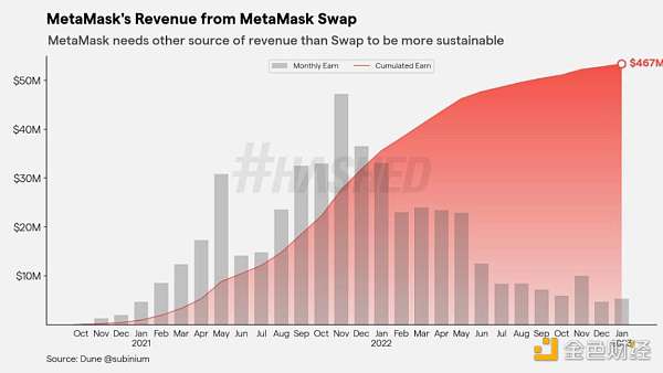 MetaMask 是加密货币钱包领域公认的领先者,并使用 MetaMask Flask 参加比赛。Flask 使开发者能够定制自己的 MetaMask 钱包版本。MetaMaskSnaps 是 Flask 的第一个功能,允许任何人扩展 MetaMask 的功能,并用不同的区块链协议来利用它。他们现在的大部分销售来源都是现货交易,收入来源单调。这种收入模式在推出后的 2 年多时间里产生了超过 4.5 亿美元的收入,但它极易受市场波动的影响。但如果他们成功地在其产品上建立一个 dApp 生态系统,他们将很容易作为一个可以获利的生态平台,从而脱颖而出。