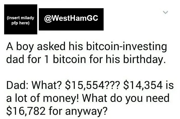 翻译:一个男孩向投资比特币爸爸要了1枚比特币作为生日礼物。爸爸答:$14354???这是是很多钱!你要这么多钱干什么??