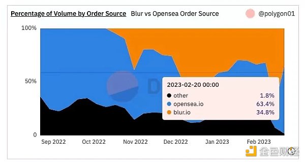 在用代币吸引用户和推出一个更好的平台之间,Blur 以占据了以太坊每周 NFT 交易的 40% 而胜出。截至 2023 年 2 月,Blur 的交易量为 77% ,而同期 OpenSea 的交易量为 16% 。