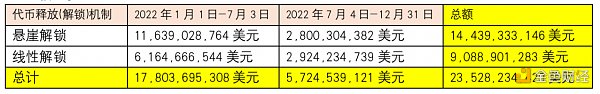 下表列出了2022年悬崖解锁与线性解锁价值的对比。数据显示,悬崖解锁的代币价值占比约为61%(144亿美元/235美元),线性解锁的代币价值占比约为39%。与此同时,我们还可以看到,2022年解锁代币的总价值达到235亿美元,且上半年的解锁价值要比下半年高出两倍之多。