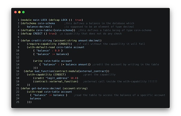 正如我们在下方代码片段中看到的,合约中的函数对另一个实现特定接口的合约进行外部调用。这允许重入一个设计好的攻击合约。Pact中的功能是内置函数,可授予用户权限来执行敏感任务。以下代码仅供说明之用,并非取自真实案例合约。