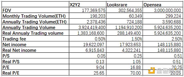 基于2023年2月6日的价格数据,我们得到了Opensea、X2Y2、Looksrare的P/S值分别为0.51、0.05、0.25。平均值为0.27;PE分别为20.25、19.04、16.88。平均值为15.39。