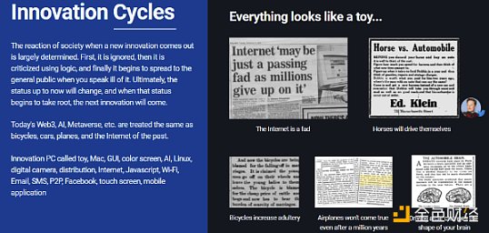 我们认为 Web3 也是如此。当一项新的创新出现时,大多数情况一开始会被忽略,然后是逻辑上的批评,再到公众的不断讨论,紧接着是大家对创新的接受,并采用。今天的 Web3, AI,元宇宙和之前的汽车,飞机,互联网等正在遭遇相似的场景。