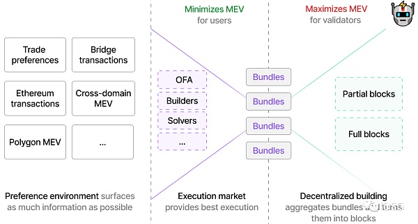 首先,用户的交易产生了MEV;其次,执行者们为满足用户的偏好而相互竞争,在同样提供最佳执行的情况下,竞争将反映在价格上,最终使得尽可能多的MEV返还给用户。这个过程可以理解为招标与择优录取。这也就是为什么在上图中,执行市场实现了「Minimizes MEV for users」。
