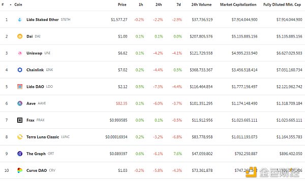 DeFi总市值及前十代币 数据来源:coingecko