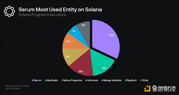 为了理解为什么会想在底层网络上做这些改变,我们可以看看 Serum 和 Solana。Solana 是一个通用的 Layer 1 区块链,被宣传为「链上纳斯达克」,目标是 400 毫秒的区块确认时间和极高的吞吐量。Solana 的主要观点是,订单簿交易平台最终将接管 AMM,而 Solana 上的指标也支持了这个观点。Serum 是建立在 Solana 之上的订单簿应用,是 Solana 生态被使用最多的应用,占 Solana 上交易的的约 1/3。