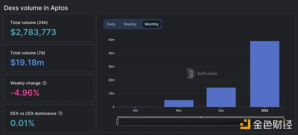 虽然 Aptos 只是第 20 大的 DeFi 生态系统,但根据 DeFiLlama 的数据,它在过去一个月有了明显的增长。Aptos 上的 DeFi 交易量从上个月的 1400 万美元上升到 1 月份的 5100 万美元,而且还是 1 月份尚未结束时的统计数据。