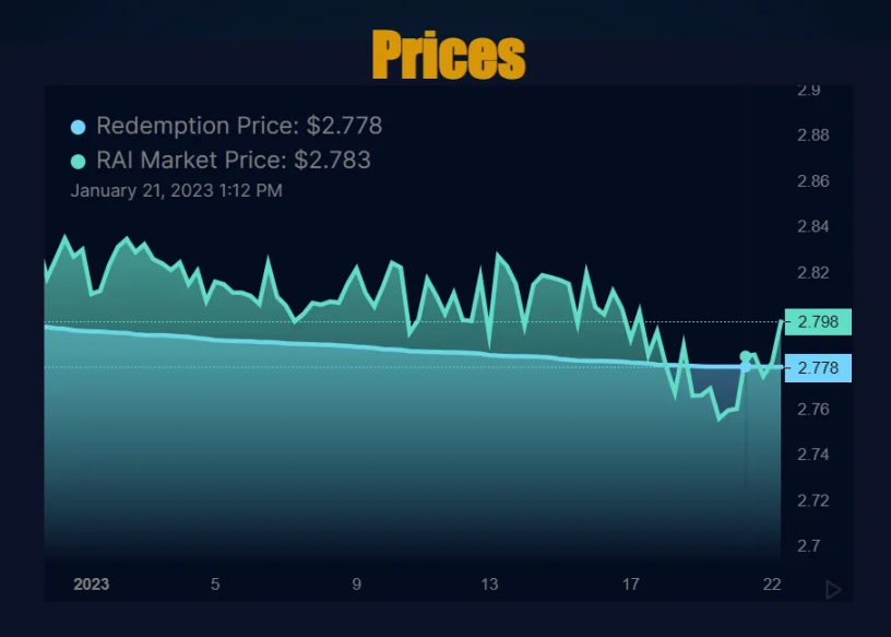 因此,RAI 的价值随着供应和需求的波动自由而稳定地浮动。在写这篇文章的时候,1 个 RAI 的价值相当于 2.78 美元。RAI 的市场价格越是偏离不断更新的 RAI 赎回目标价格,基础算法就越是调整利率,套利者会将这两个价格重新拉近。