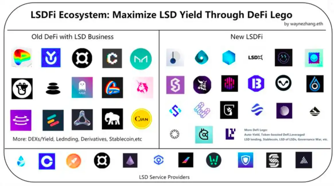 LSDfi 指的是一组基于 LSD 的协议。它包括了一系列项目,可能涵盖了经典的 DEX 和借贷协议,以及利用独特的 LST 属性构建的更复杂的协议。