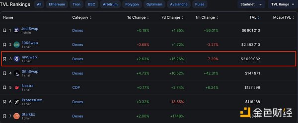 mySwap 是一种 DeFi 协议,目前在 Starknet 协议中根据 TVL 排名第三。
