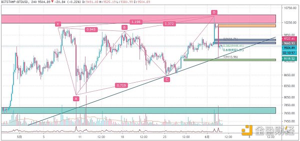 日线图上可以看到一根长长的放量倒锤子线,这个信号对多头非常不利,首先是昨日在临近10300附近的日线供给区时,有大批空单建仓,其次从形态上看,还有二次下跌的可能;昨日的高点位置恰好在这个蝴蝶图形的D点位置,那下方第一目标点位在9259,第二目标8820美金;小时OBV显示主力资金已经获利了结,部分空头也已经平仓,但暂时并没有发现新的多头资金进场,行情大概率还有一次下杀,8820是多头防守的关键位置。