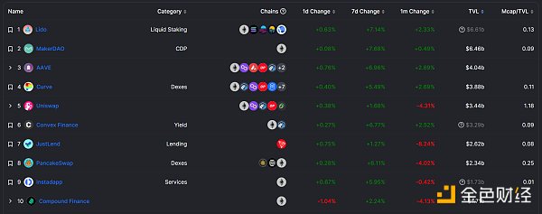 DeFi项目锁定资产前十排名及锁仓量 数据来源:defillama
