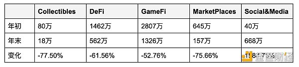 表 1: 2022 年 Web3 各种应用活跃地址数变化