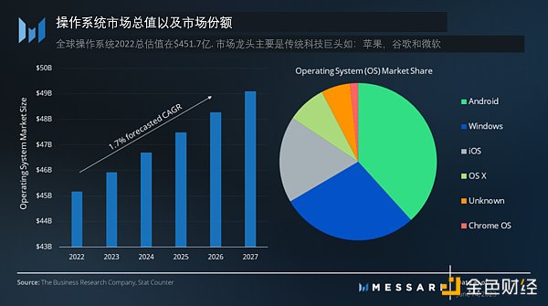 全球操作系统市场预计从 2022 年的 451.7 亿美元增长到 2027 年的 491.0 亿美元,复合年增长率为 1.7% ,涵盖了多个主要参与者。龙头公司中,传统科技巨头微软、苹果和谷歌占据重要地位。微软凭借广泛使用的 Windows 操作系统,在台式机、平板电脑和游戏主机操作系统市场占有重要地位。苹果则在移动和台式机领域中以其分别使用的 iOS 和 macOS 操作系统具有显著影响力。另一方面,谷歌是 Android 操作系统的创建者,它是世界上使用最广泛的移动操作系统,同时还开发了 Chrome OS,主要面向笔记本电脑和台式电脑。