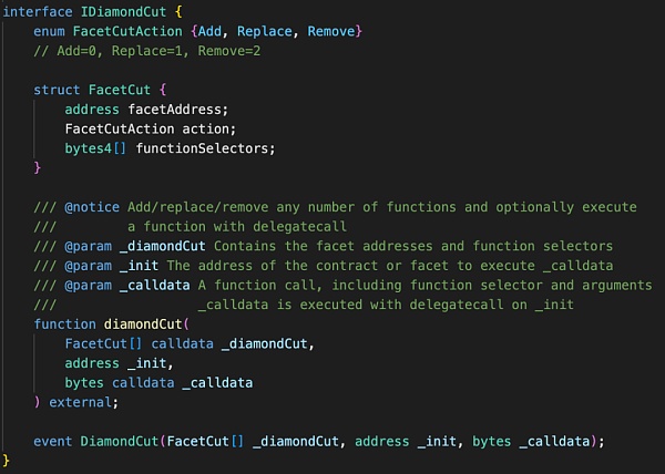 每个FacetCut结构都包含一个切面地址和四字节的功能选择器数组,以在钻石代理合约中进行更新。FaceCutAction允许人们添加、替换和删除功能选择器。diamondCut()函数的实现应该包括足够的访问控制,防止存储槽的碰撞,在失败时进行恢复等。