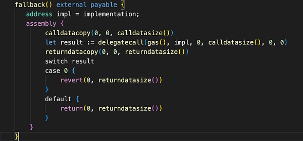 所有的代理都使用fallback()函数,将函数调用委托给外部地址。下面是钻石代理的实现和传统代理的实现。