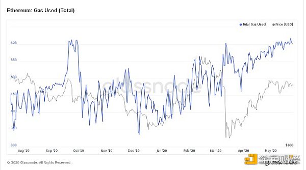 此外,数据显示,以太坊上的Gas使用量已达到历史最高水平。这表明在以太坊2.0的预期下,以太坊区块链网络上的用户活动水平正在飙升。