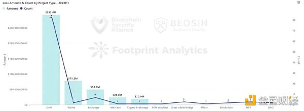 2023 年上半年,DeFi 类型项目共发生 85 次安全事件,占总事件数量的 78.7% 。DeFi 总损失金额达到了 2.92 亿美元,占总损失金额的 62% 。DeFi 为被攻击频次最高、损失金额最多的项目类型。