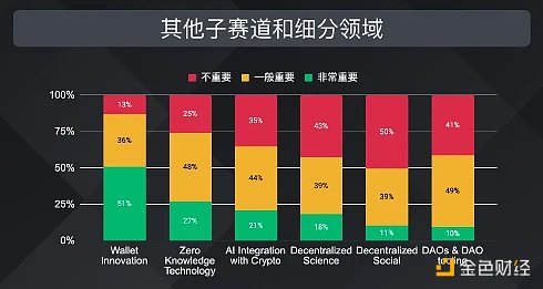 ● 基础设施与创新: 53.9% 的投资者表示,他们或他们所管理基金最重视的是基础设施项目,其次是 Layer 1 和 Layer 2 技术(分别为 48.1% 和 43.8% )。问及具体领域时,有 51.0% 的用户表示钱包领域的创新(如自主托管、UX/UI 改善)也很重要。