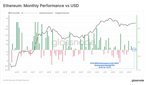 最近几周,数字资产市场受到了BTC ETF申请的影响,BTC的表现明显优于其他资产。虽然贝莱德申请BTC ETF的举措让ETH价格提升了11.2%,但第二季度收盘时,它仅比4月的开盘价高出6.4%,价格出乎意料的稳定。