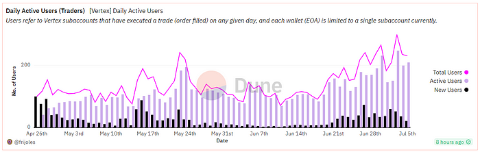 Vertex是新近表现较好的一个衍生品DEX协议,其自2023年4月底上线以来,近期日交易量约占资金池模式衍生品DEX市场的10%至15%,并于2023年6月获得Wintermute的战略投资。
