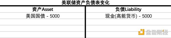 美联储购买 5000 美金的国债时,美联储资产负债表的资产端多出了 5000 美元的债券,负债端则多出了 5000 美元的高能货币,此时高能货币就被“凭空”创造了出来,市场上从此多了 5000 美元的流动性。