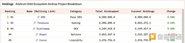 在接收空投金额最大的一批协议中,GMX(800 万枚 ARB)、Uniswap(430 万枚 ARB)、SushiSwap(420 万枚 ARB)和 Curve(330 万枚 ARB)尚未使用任何空投代币,也没有发布任何值得关注的治理提案来分配资金。Arrakis 正在提议通过 Arrakis 将 Uniswap 获得的空投代币分发给 DEX 上的流动性提供者。