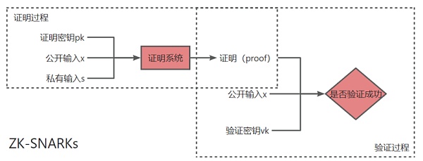 当验证方接收到证明后,使用公开输入、证明和验证密钥来验证该证明,并返回验证结果(即是否验证成功)。