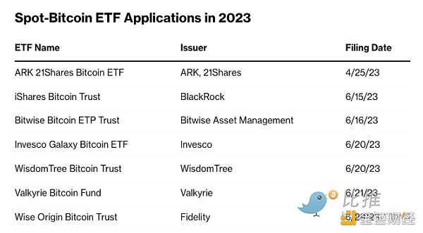 贝莱德的 ETF 申请得到了巴克莱银行前首席执行官Bob Diamond的认可,它还带动了 WisdomTree、Invesco 和 Valkyrie向 SEC提出新的申请,同时助力比特币价格在 2023 年 6 月重返 30,000 美元以上。