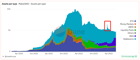 该事件之后,Maker内最大抵押资产为USDC一事再次点燃社区讨论热度,也令社区担忧。因此,MakerDAO试图将其资产负债表多样化,下调USDC的市场份额。目前该项数字已经下降至4.4亿美元左右,下降幅度达到80%。与此同时,stETH作为DAI抵押品的份额大幅上涨,从原来的6.5亿增加至11亿,涨幅接近80%。