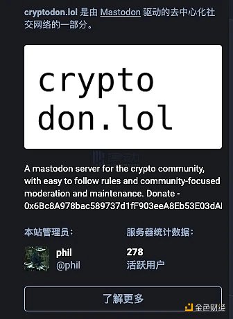 值得一提的是,以太坊基金会成员 boffin Phil Daian 在 Mastodon 上运营了一个名为 cryptodon.lol 的加密社区,Vitalik 也已加入其中。