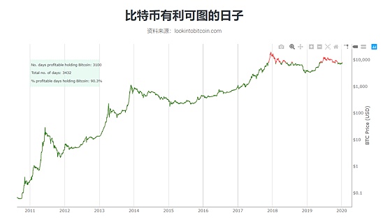 Lookintobitcoin网站显示,90.3%的日子里,比特币都是有利可图的。除了2017年年底和2019年中旬,无论什么时间进场,只要你能Hodl到今天,不说赚多少,至少都不会赔本。
