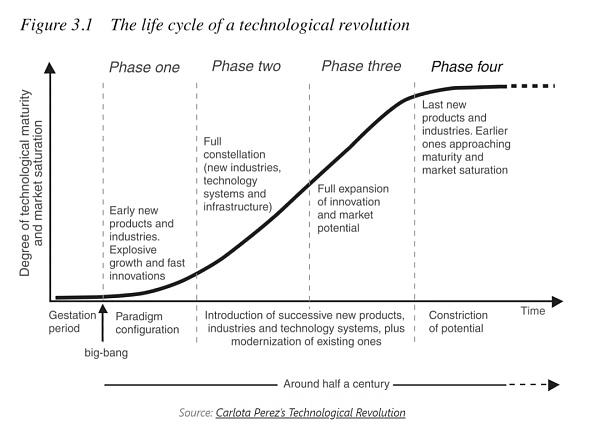 基础设施可负担性的重要性(在 AI 的语境下,是计算、传递和存储数据的硬件成本)在卡洛塔·佩雷斯(Carlota Perez)的“技术革命”框架中得到了突出体现。该框架提出,每一次技术突破都有两个阶段: