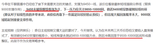 目前的客观走势及应对策略:简单回顾一下,在周五的千聊直播和晚评中我们的分析结论都指向价格延续升势的概率更大一些,短期关键支撑-9450有效破位的概率小,从实际走势看还是相符的。币价在9450附近出现过两次虚假下破,不过最终都很快拉升回来,说明我们这次的关键位又找对了。