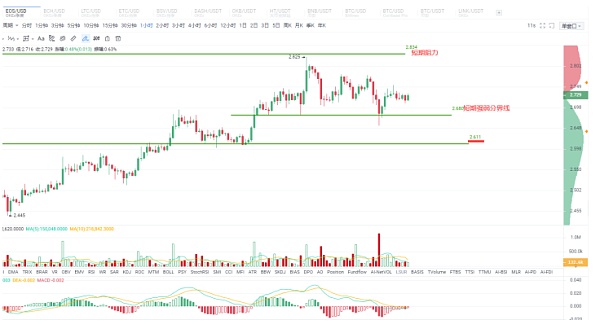 截图来自OKEX EOS季度1小时图:目前的客观走势及应对策略:上周五的晚评中没有单独写EOS,但在上午的千聊直播中有讲到。当时给的方向是跟随BTC向上,关键支撑是2.6一线,关键阻力在2.83,从这几天的实际走势来看,我们给的这两个关键位都被验证了。币价的回落正是在2.6一线的反复支撑下企稳回升的,而最高涨至2.825后出现了明显回落。